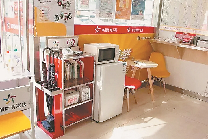 配有微波炉、雨伞、血压计的体彩驿站。