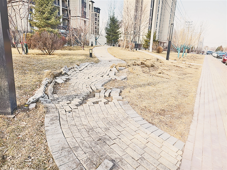 当日9时许,记者来到现场看到,此区域的步道板大面积移位,散落在绿地里,市民路过都很小心,“这几天突然发现的,出行非常不方便。”刘先生说。