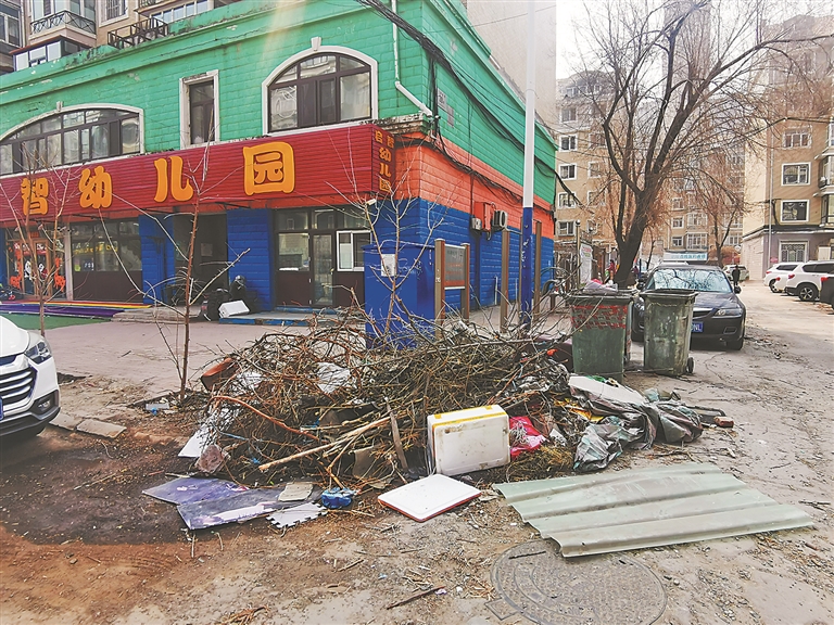 记者走访时发现,小区内垃圾随处可见:18号楼附近的绿化带内堆放着不少垃圾,有的丁香树已倒伏,一个高近50厘米的垃圾堆占据了甬道;19号楼附近,甬道两侧堆积着塑料袋、包装盒等垃圾杂物;小区内一家幼儿园门前,树枝和包装箱堆放在甬路旁。小区业主孙女士告诉记者,该小区物业管理一直存在问题,而现在垃圾清理不及时的情况已经影响到了居民的正常生活。