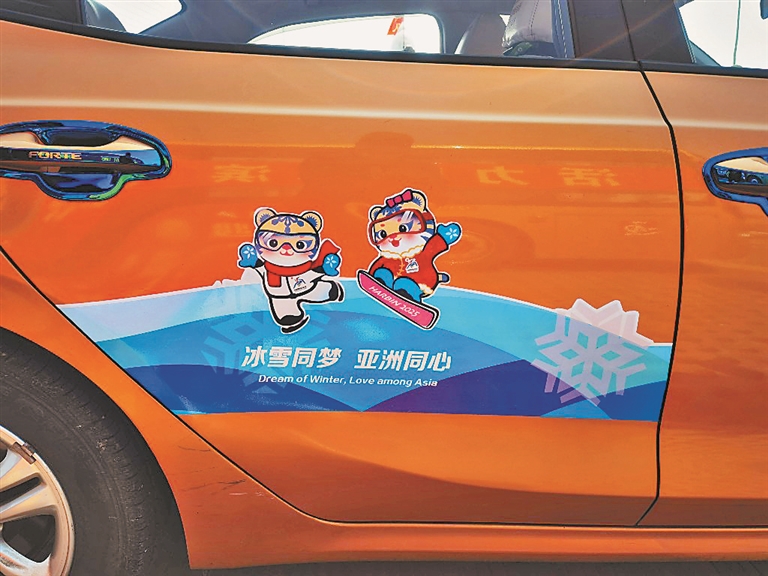 14日上午,记者在冰雪大世界西侧停车场看到,来自哈尔滨交通集团的一排公交车以及龙运现代公司等企业的出租车洗刷一新,有的车辆还张贴了喜迎亚冬会的贴纸。