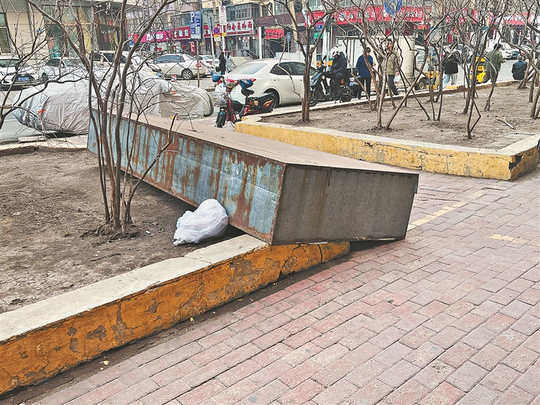 生活报讯 (记者刘维娜 李丹 文/摄) 4月17日,记者接到市民汪先生反映,邮政街69号门前,花坛上有一个大铁皮箱,影响市容。记者随后与哈市城管局工作人员一同到达现场踏查。