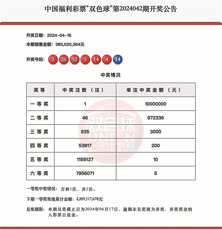 4月16日晚,中国福利彩票双色球游戏第2024042期开奖,本期双色球开奖号码为2 4 5 14 26 32 14。