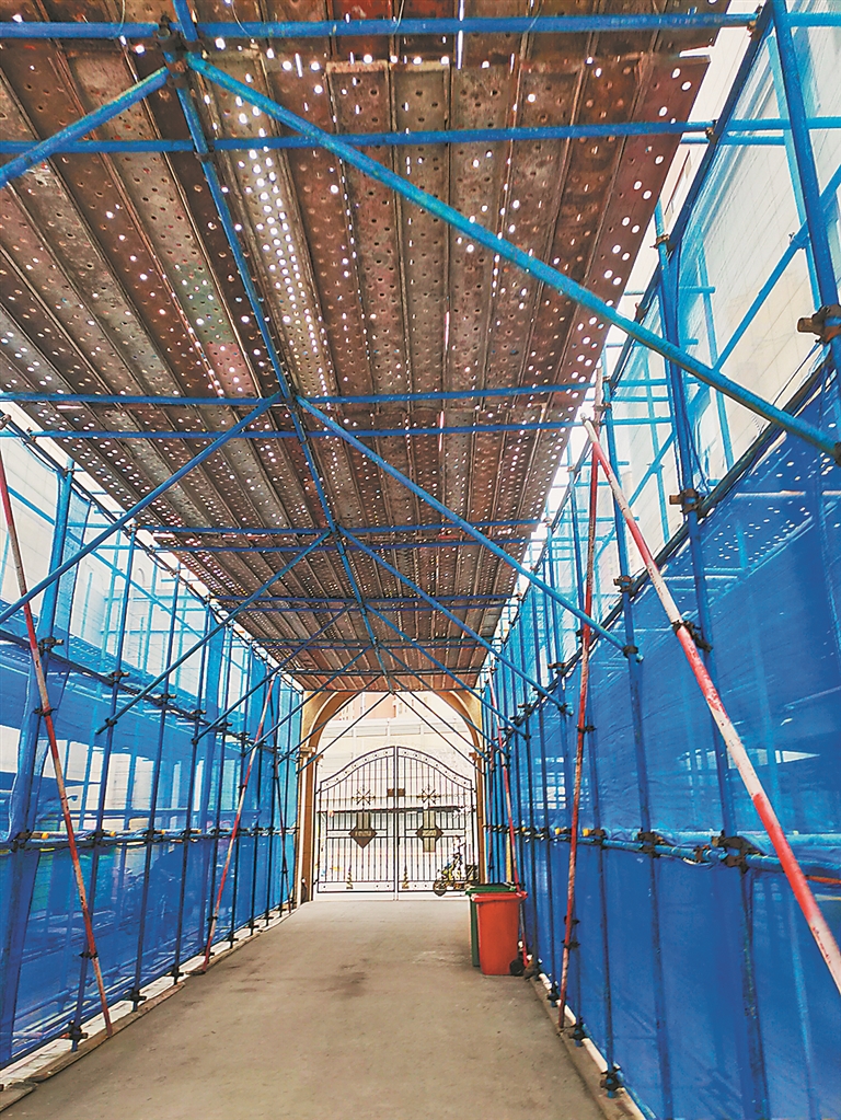 住在宏泽中央公园小区的孙女士说:“墙体脱落严重,小区共有两栋楼,6号楼和7号楼,7号楼搭架子设围挡已经1年多了,没人管。现在6号楼和车库也开始搭架子设围挡了,墙皮不仅掉院子里,也会掉到文昌桥上和小区道边,仅在小区里设围挡,来回出入还是有被砸的风险。小区几乎没有活动空间了,感觉生活在工地一样,太憋屈了。为啥光搭架子设围挡,就不赶紧修呢?”