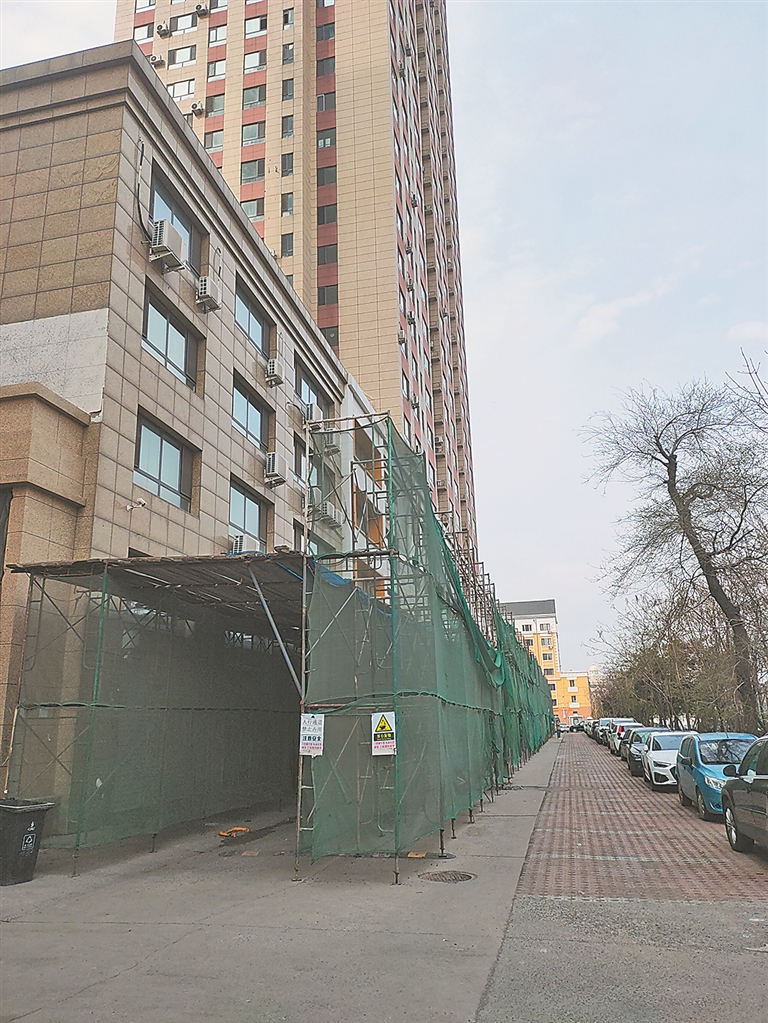 生活报讯 (帮办记者李威兵 文/摄) 22日,哈市市民通过本报热线反映,南岗区宏泽中央公园小区楼顶掉墙皮,楼下全都是围挡,已经设置一年多了,到现在还没修理掉墙皮的地方,不知道要围到什么时候,出行不便。23日,帮办记者进行了采访。