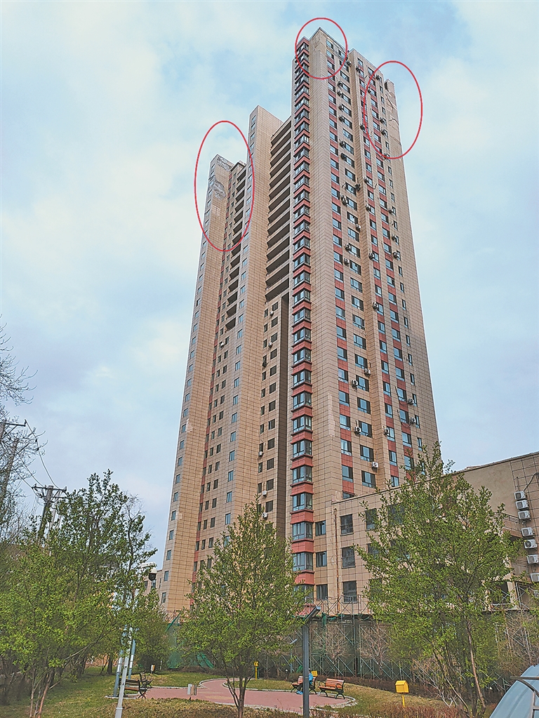 记者看到,该小区居民楼最高为32层,楼顶已有部分墙皮脱落,楼体墙面上留下多处大块的“疤痕”。正在楼下散步的张大娘说:“都围了一年多了,不围上能砸死人,围上多少能安全点。就是他们光搭架子不修墙,现在真是太憋屈了,也不敢在楼下多待,出门就得赶紧离楼远点,害怕被砸到。大水泥块从30多层的楼上掉下来,想想就吓人,我们现在就盼着赶紧修好。”