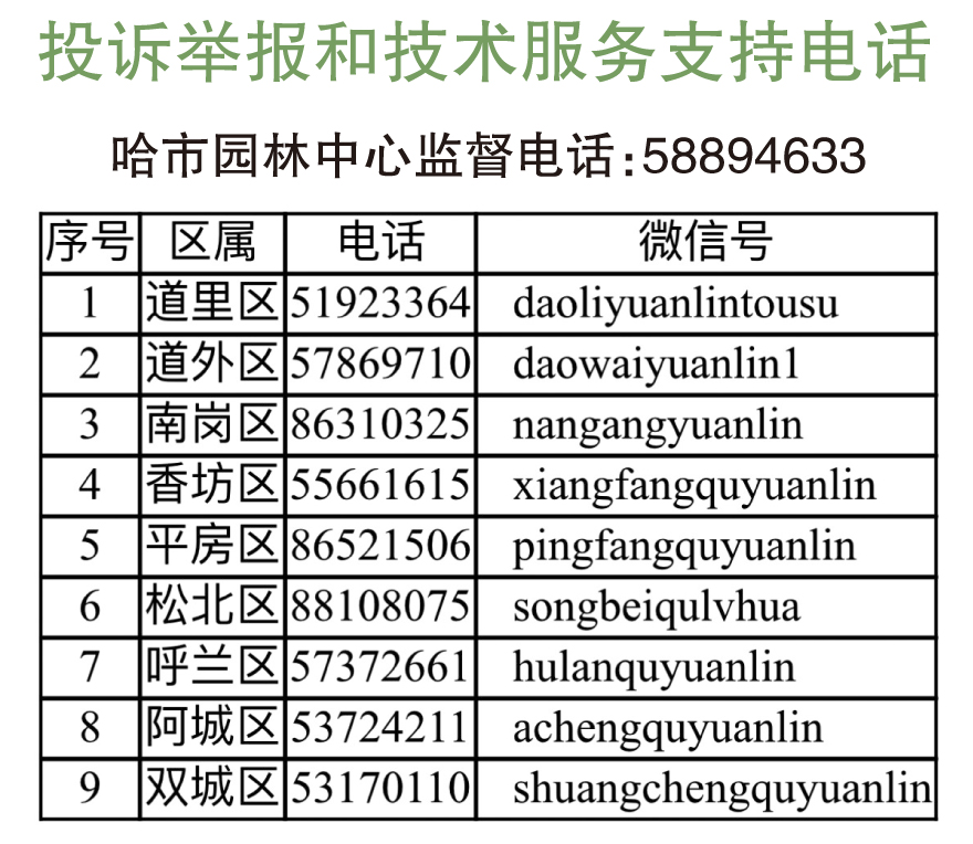 市民如发现擅自砍伐树木、损毁绿地、过度修剪等情形,或者需要提供园林技术服务的,均可在工作时间(工作日8时至17时)拨打各所在区园林部门电话或添加微信号,进行投诉举报和技术服务支持。在奖励标准方面,哈市各区政府将根据不同处罚情况给予50至10000元奖励。