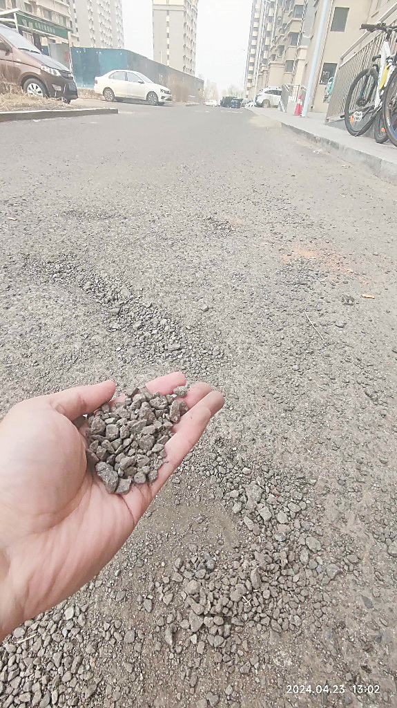 “这才一年多,路面几乎就破烂不堪了,我们要求棚改办督促施工方,再给铺一遍沥青,现在的路面坑坑洼洼,满地石子。”据居民介绍,福佑家园是棚改项目,大多数居民于2022年11月入住,当时柏油浇筑的路面很光滑,可一年多以后,路面就开始大面积出现起砂、脱粒等问题。