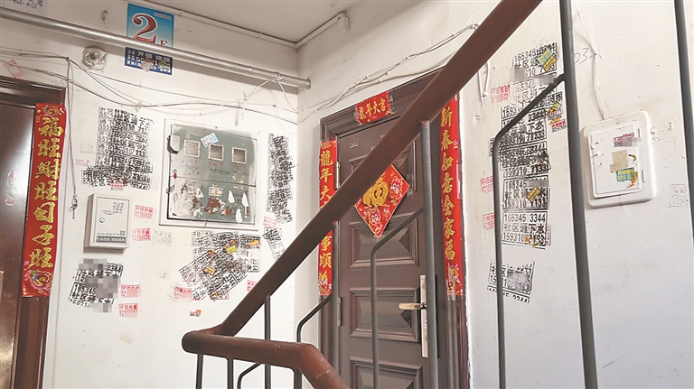重型家属楼的居民告诉记者,去年小区旧改后新刷的白墙,一夜之间就被各种小广告给覆盖了。