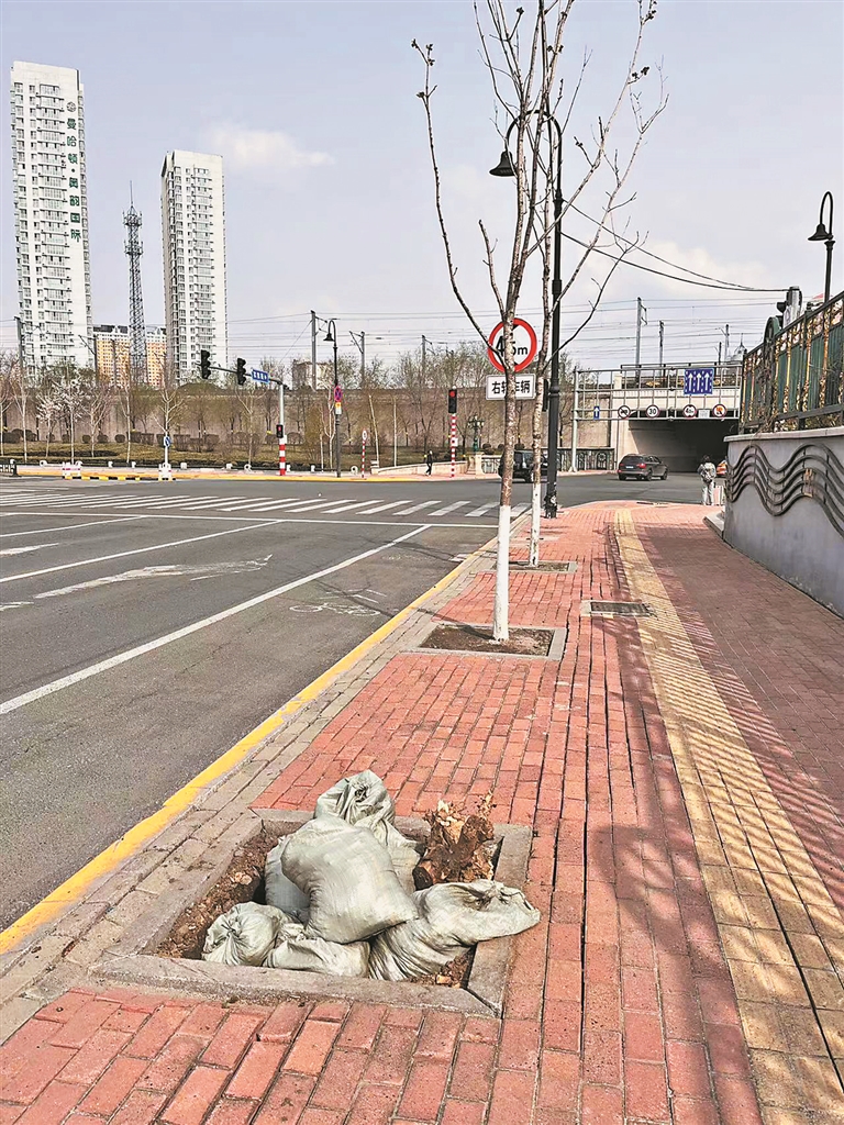 生活报讯 (记者刘维娜 李丹 文/摄) 3月19日起,哈市城管系统联合生活报开展“与您共建共管共享美好家园”主题活动,合力向城市管理存在的各种问题和群众反映强烈的各类“闹心事”亮剑。4月25日,记者接到市民刘先生反映,地工街和买卖街交口处的绿化带缺了很多树木,树坑被一些胶丝袋覆盖着。