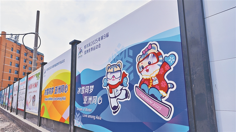 记者近日走访发现,南岗区宣化街与长江路交口处布置了近70块印有亚冬会或创城元素的公益广告,“冰雪同梦 亚洲同心”“哈尔滨2025”等宣传语清晰地在展板上展示。此外,还有亚冬会吉祥物“滨滨”“妮妮”及赛事会徽的彩色图案,每块展板大概2.5米长。在南直路和闽江路交口处,也有近150米的亚冬宣传展板。