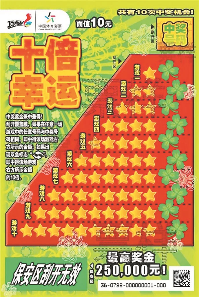 “十倍幸运”于2009年12月首次上市,面值10元,最高奖金25万元,一直延续销售至今,成为经典,始终传递着顶呱刮的公益正能量价值。顶呱刮“十倍幸运”票种以鲜艳的红、绿两色为票面主色调,其中,翠绿的四叶草是幸运的象征,它所覆盖之下的便是每场游戏的奖金金额,而在闪亮的黄色五角星覆盖之下的便是每场游戏中玩家的号码。