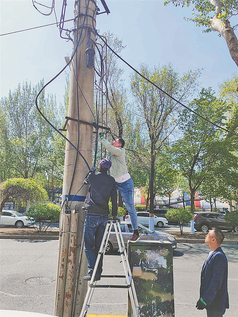 8日上午,在和兴路,南岗区城管局工作人员对街路上的废旧线缆进行拆除作业,对设置不规范的线缆进行绑扎规范治理。