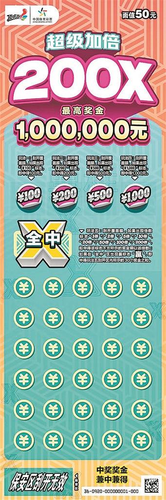 生活报讯 (于正) 日前,体彩顶呱刮“X”主题系列票“超级加倍Ⅲ”换装登场,该玩法一改以往单一色系,撞色搭配上市。“超级加倍Ⅲ”分为10元、20元、50元三种面值玩法,10元与20元玩法最高大奖为100万元。