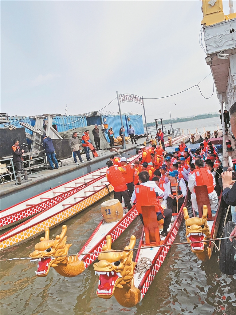 当天9点,哈工会码头前,哈尔滨电机厂有限责任公司龙舟队、东北轻合金有限责任公司龙舟队以及哈尔滨城发投集团龙舟队的队员们已经开始了热身,大家下水前都在整理装备、安装龙头。上船后,队员们进行了祭舟、祭江仪式。随后伴着阵阵鼓声,3艘龙舟驶出码头,队员们奋力划桨,在江面上画出一道道洁白、优美的曲线……