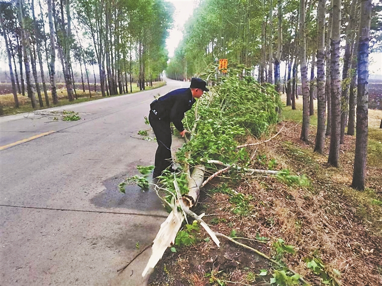 生活报讯 (记者黄迎峰) 5月9日16时,正在巡逻的哈尔滨市呼兰区杨林派出所民警刘红洋突然发现,受近日连续大风天气影响,路边多棵树木被大风刮断倒在路间,导致道路无法通行,多台车辆堵在路边。