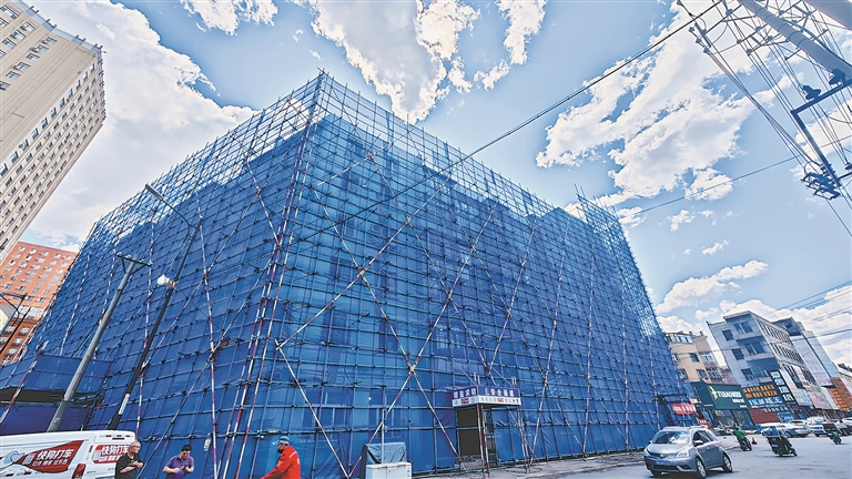 当日10时,记者来到哈市道外区承德广场旁的一工具小区1号楼看到,6层高的住宅楼已被蓝色的安全网覆盖,红白色的脚手架交错相连。为了不影响1楼门市正常经营,在每个门市门前都留有一个方便出入的安全通道。“进场前,我们多次组织相关人员现场踏勘,查看小区现状,发现违建460处并已上报,2日正式办理完施工许可证后我们便陆续进场了。”省安装公司施工负责人王鹏介绍。