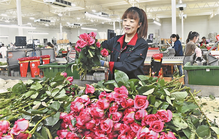 在甘肃临夏市,百益亿农国际鲜花港已累计带动当地群众500多人实现了家门口就业。百益亿农国际鲜花港工作人员苏婷婷说:“在这上班每个月能获得4000元左右的工资收入,还可以就近照顾家里的老人和孩子。”