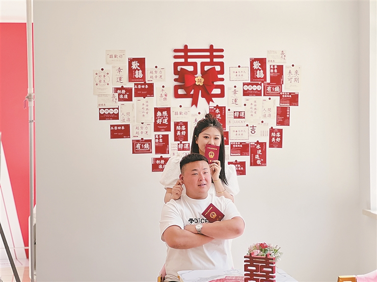 在登记大厅里的“结婚誓言书”背景墙前合影留念的新人冯先生和张女士,手提“双喜临门”的红灯笼告诉记者,登记的日子是两人尽心挑选的,今年的“5·20”不仅是表白的日子,又恰逢小满节气,寓意着二人以后的日子能够幸福美满。