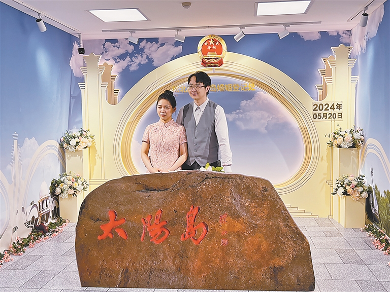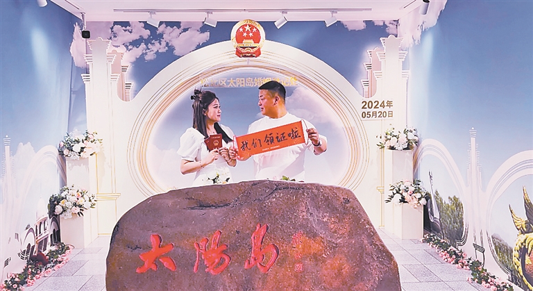 9时30分许,在太阳岛婚姻登记处门前,已有多对新人身穿婚纱、旗袍等礼服,在“我们结婚啦”“爱心鲜花”“爱的心跳”等拍照背景墙前,甜蜜地拍照留念。刚从登记处领完结婚证的周先生和林女士告诉记者,“5·20”是个比较特殊且有纪念意义的日子,在这个日子里来到风景如画的太阳岛风景区登记、领证,就是想给人生中这一重要时刻锦上添花。他们还特意带了摄像师来记录这个美好的日子,一会还准备在景区内多拍些美照。