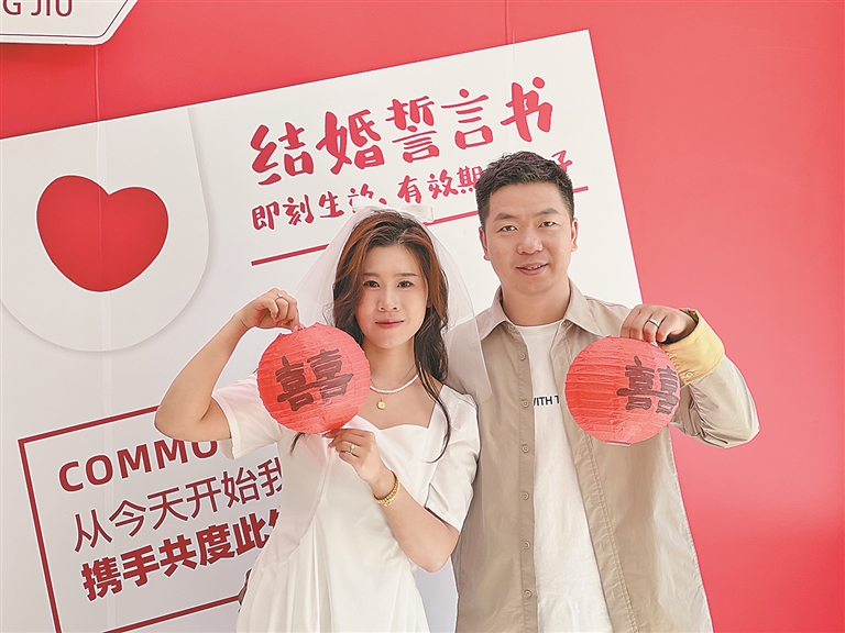 新人杨先生和刘女士甜蜜地挽着手告诉记者,“5·20”和“5·21”是“我爱你”的日子,又是农历四月十三和四月十四,这也寓意了他们之间的爱情能够“一生一世”长长久久。