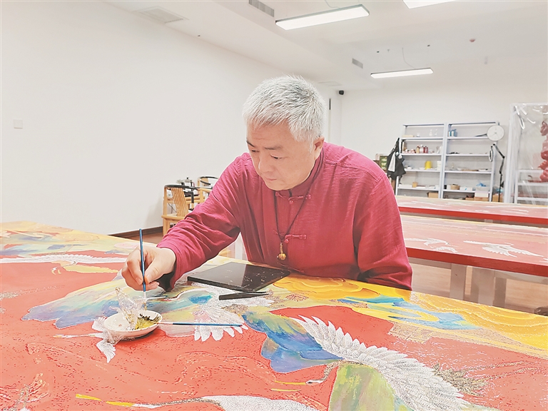 漆画作为金漆镶嵌艺术品的一类,对匠人的技艺是有很高要求的。“漆画创作经常会镶嵌蛋壳、松石、玛瑙等材料,有时根据作品需要我还会用到鲍鱼壳。”多年的创作中,夏立军最满意的一幅漆画名为《国漆颂党恩》,这幅660厘米长、100厘米高的漆画长卷整体呈红色,画卷上56只振翅高飞的丹顶鹤是用白色、不规则的蛋壳一点一滴镶嵌而成。画卷中的山脉、长江、黄河、长城,采用景泰蓝掐丝工艺绘制,并镶嵌了大量珍珠、玛瑙、绿松石等石料颗粒……这幅漆画是由夏立军和团队耗时近一年才完成,光材料的成本费用就有十几万元。对于这幅漆画打算卖多少钱的问题,夏立军笑着说:“这是我们团队献给祖国,献给党的礼物。”