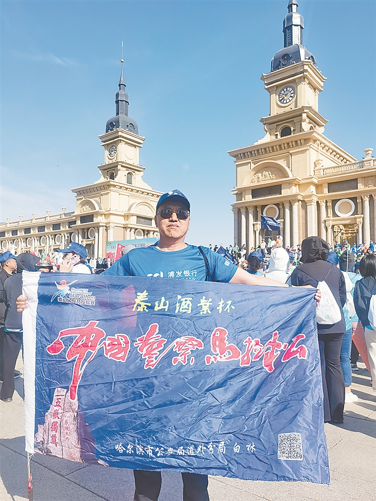 7时30分,距名枪还有一段时间,现场已人山人海,一位拿着“中国警察马拉松、哈尔滨市公安局道外分局白林”旗帜的市民引起记者的注意。