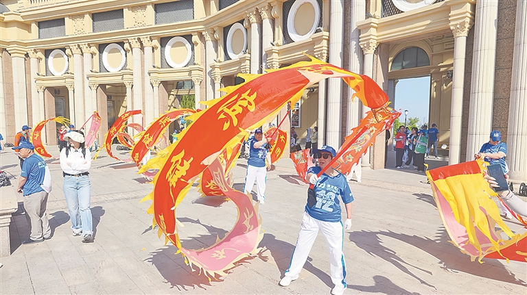 徒步节现场,有一群特殊的参与者格外醒目,他们每人手中拿着龙头绸带,龙头被牵起的瞬间,彩绸随之腾起、翻飞,吸引大批市民观看,现场欢呼声一片。“我们是哈尔滨健身龙艺术团。”团员朱先生介绍说。