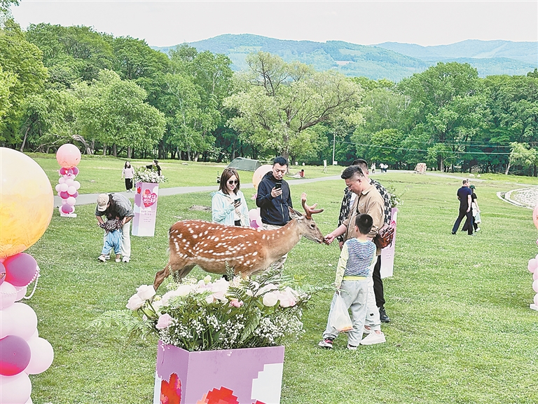 青山为幕,芳草为席,淡粉色气球装点着森工平山皇家鹿苑的“醉美草坪”……5月25日9时50分许,一场浪漫氛围拉满的单身青年男女联谊活动,在景区鹿苑中心点的开阔地正式开启。纯天然的森林风光、悠扬的乐曲、近在咫尺悠闲漫步的梅花鹿,把现场氛围烘托到了极致。