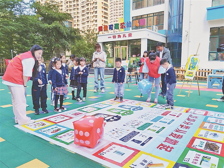 随后,“垃圾分类飞行棋”趣味游戏开始了。参加游戏的小朋友通过投掷骰子,根据指引向前行进,回答途中设置的各种问题,成功抵达终点可获得小礼品。