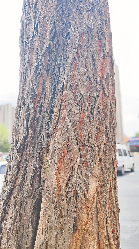 随后,记者来到群力第二大道,一辆黄色的园林作业车正在施工,几个工人正用长锯锯断还未处理的死树。记者发现,锯断的树皮呈浅褐色,树皮干瘪开裂,有很多道橘红色的粘稠性物质延伸至整个树干。树枝也是干枯的状态,没有一点绿色。“这棵是榆树,之前很多死树都是柳树。”工作人员介绍说。之后,记者在群力第四大道也发现大量锯断的树木。