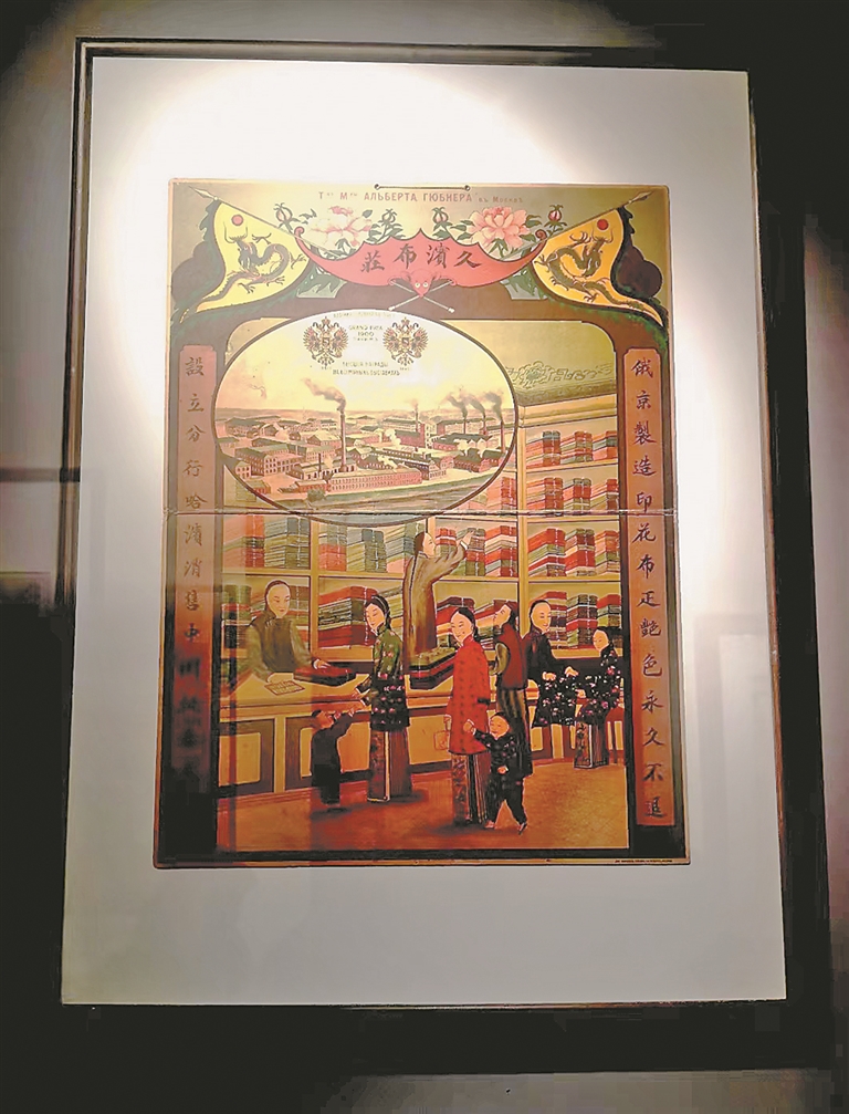 久滨布庄的广告摆放在展厅的重要位置。一个布料店内的忙碌场景,加上一座烟囱冒着烟的工厂远景构成了这个广告的主要内容。“19世纪末至20世纪初,随着中东铁路的开放,哈尔滨成为了一个重要的通商口岸,促进工商业开始发展。哈尔滨被辟为商埠,全面对外开放,吸引了欧美等国家侨民涌入。20世纪20年代,哈尔滨成为远东国际贸易中心,哈尔滨的商业和工业都得到了快速发展。本展品为哈尔滨最早的商业广告——久滨布庄广告,它是上世纪哈尔滨商业起步发展的缩影。”杨伟东说。