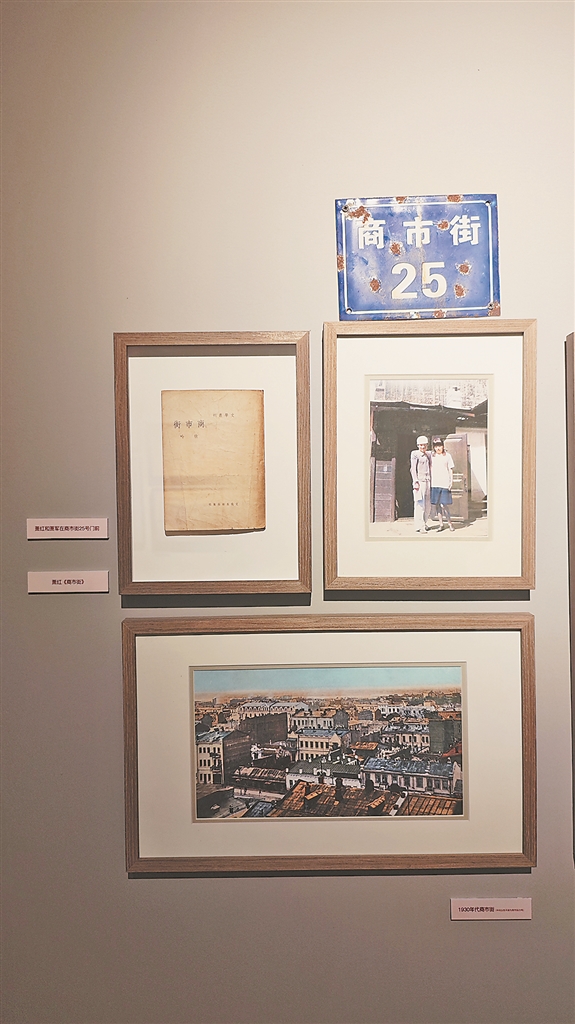 一张著名作家萧红与萧军互相搭着彼此肩膀的老照片引人注目,旁边还有一张旧迹斑斑的蓝色老街牌挂在上面,街牌上可见“商市街”三个大字,照片左侧还展示了一本名为《商市街》的萧红散文集。