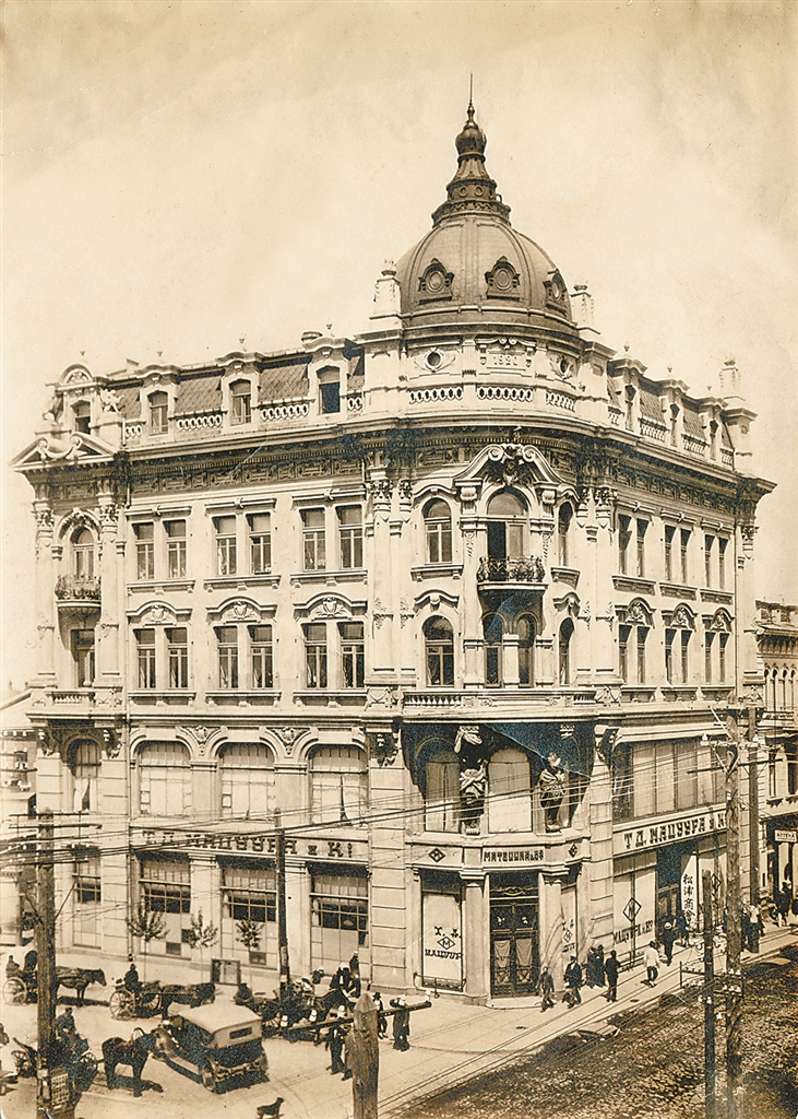 松浦洋行建于1920年,具有巴洛克特征的折中主义建筑风格,也是中央大街唯一一座巴洛克风格建筑,2004年被评为中国历史上最有代表性的100座建筑之一。1945年为苏联侨民会,后为新华书店,如今是一家集文创、西餐、博物馆于一体的高级西餐厅,餐厅细节中处处透露着上世纪的巴洛克风格对其的影响,虽历经百年时光流转,但“松浦洋行”风韵不减、品位犹存。下面的展柜内陈列着当时的发票、明信片及原版照片。