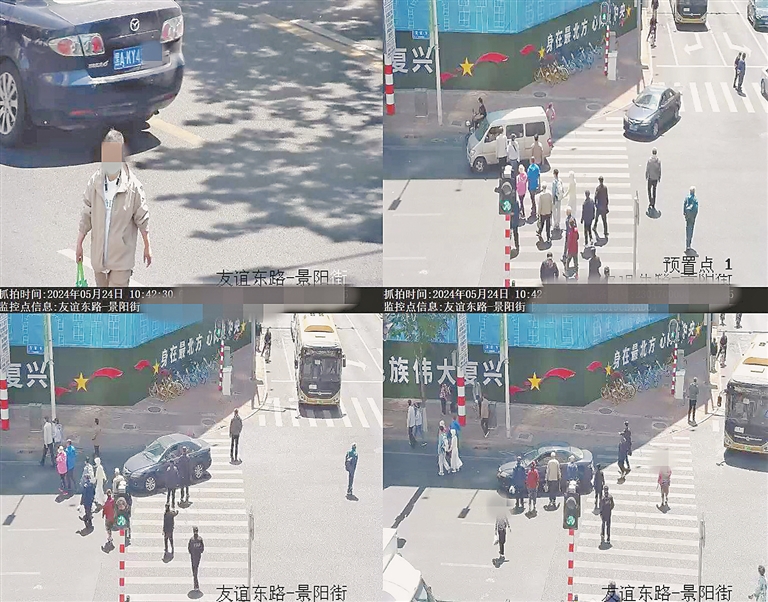 交警部门调取南勋街和南十四道街路口的监控发现,5月24日14时50分许,当人行横道信号灯变绿后,5名行人正准备通过道路时,黑AM3M0*号的白色轿车突然右转,过街人员只好无奈等在原地。30分钟后,黑A5L1Z*号白色轿车再次上演此种情形,将5名行人和1名骑行人员“挡”在了路口处,直接驶过此处。上述违法行为将被处以50元罚款、记3分的处罚。
