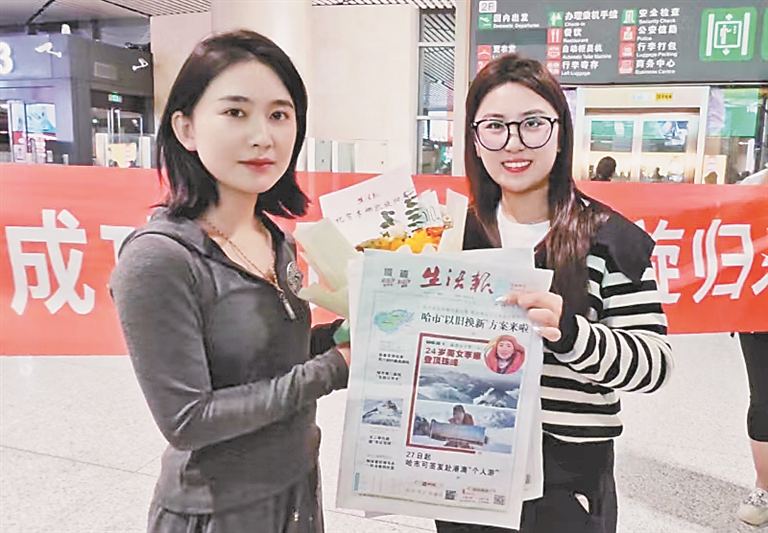 29日19时20分许,随着南方航空CZ6256航班在哈尔滨太平国际机场缓缓降落,黑龙江女子登顶珠峰第一人李娜回到了家乡,肇东市文旅局局长刘畅等人到机场迎接。本报主持人瑞焓代表生活报读者送上了写有“祝贺李娜凯旋归来”贺卡的鲜花。