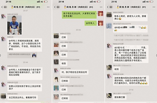 此后,社区警务队迅速将消息发布至辖区的92个网格微信群内,建立实时在线响应机制,全力帮助男孩寻找家人。功夫不负有心人,寻人信息通过微信群一传十、十传百,在全民的爱心接力下,有居民在朋友圈中认出了这名男孩,并及时联系到孩子家长,通知其去派出所接孩子。