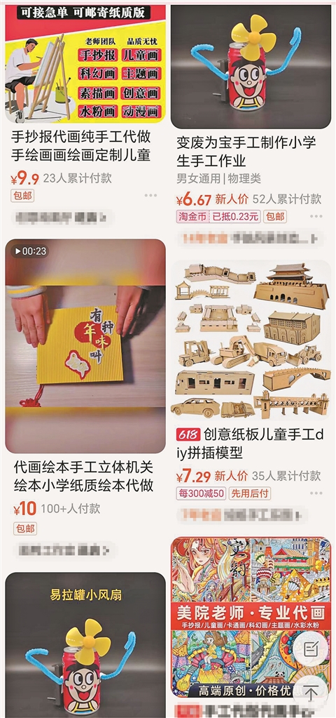 记者根据家长们的讲述,在某电商平台输入“代做手工作业”进行搜索发现,“代画手抄报 半小时交稿”“老师代画 可接急单”“纯手工定制 下单前先找客服”等店铺广告比比皆是。