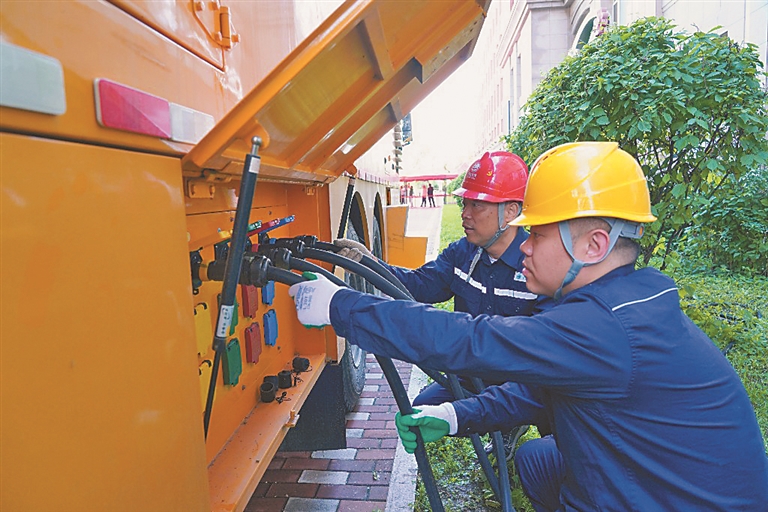 6月25日,国网哈尔滨供电公司保电员工丛建民、王佳男在哈尔滨市第九中学考场外接好应急发电车,为中考考生保驾护航。闫爽 摄