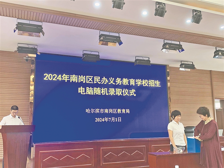 生活报讯 (记者吕晓艳 文/摄) 1日9时,哈尔滨南岗区教育局举行2024年南岗区民办义务教育学校招生电脑随机录取仪式,生活报记者现场直击哈工大附中小学部和初中部、松雷中学、中实学校电脑随机抽签录取全过程。此次电脑随机录取由各级领导、纪检部门、公证处、家长代表、民办学校校长、媒体等共同监督,由工作人员具体操作电脑随机录取。