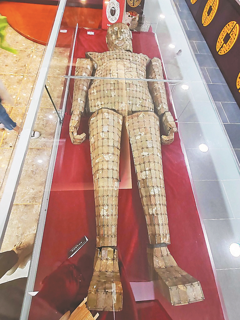 据彭喜才介绍,这几年博物馆最大的变化当属新增加的“镇馆之宝”——金缕玉衣,它静静地躺在馆内正中央的玻璃柜内。这件文物是2020年收来的,衣服分为头部、身部、腿部、脚部,全身共由1960片玉片组成,其中脚部玉履的玉片有140片,每只脚各70片,被称为汉朝时期最高贵的“衣履”。
