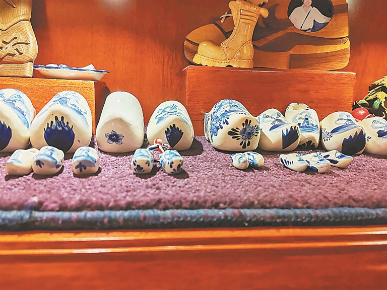 在彭喜才的办公室,有一面墙专门打了柜子,放置了各种鞋类工艺品,其中最引人瞩目的是一整套“瓷鞋”。彭喜才说,这是荷兰风车鞋,最小10cm,最大30cm。“这些鞋都是前辈钟漫天老师赠送的,他希望鞋文化能够永久流传。”