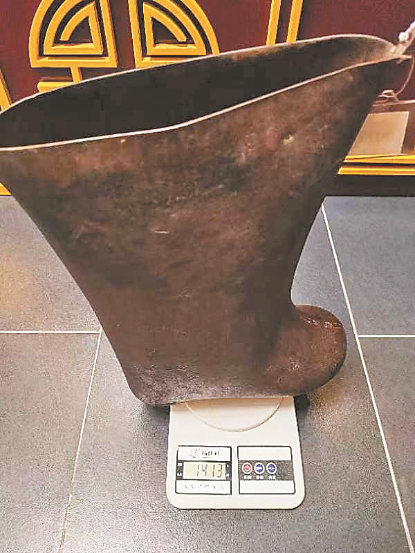 到了清代,武官和文官的靴子也颇有讲究,武官战靴为牛皮所制,铁钉护底,一是为了防滑,二是为了更好受力;而文官所穿的靴子底部越厚,证明官爵越高。经工作人员现场测量,武官战靴重量在2.8斤左右,而文官穿的靴子相对较轻,仅有0.6斤。