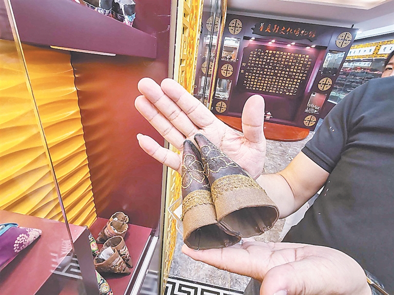 博物馆内,各时期的古鞋令人眼花缭乱。彭喜才随手拿起一双巴掌大的鞋放在手上,“这就是‘三寸金莲’,它是人类史上最独特的一种鞋类文化。”据介绍,这种极端的审美情感最早始于五代十国时期。文献记载,“三寸金莲”是南唐最后一位皇帝李后主的“杰作”,这位皇帝喜爱音乐和美色,他令宫女用帛布裹足,使脚纤小弯曲如新月状,并在六尺高的金莲花台上跳舞缠足,因此得名“金莲”。彭喜才说,古代女性地位低下,男方追求的是一双纤细的小脚。展柜里一双黄色的“三寸金莲”引起了记者关注,鞋的正面已经部分破损。“这些鞋中属它高贵,是皇室所穿的‘三寸金莲’。”彭喜才说。