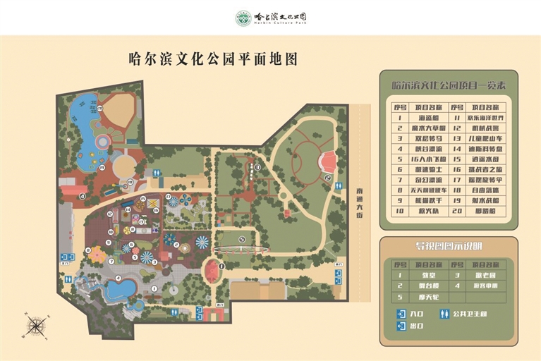 据哈尔滨文化公园有限责任公司经理乔海波介绍,原封闭式游乐园于2020年10月改造成开放式城市公园,取消了原有的游乐设施项目。此次焕新升级后的文化公园预计开放大、中、小型游乐设施共计20套,其中11台套游乐设施在原有基础上改造升级,9台套游乐设施是原有设备大修升级,可满足不同年龄段游客的游玩需求,具体包括:自由落体 、挑战者之旅、魔术大草帽、海盗船、摇摆旋转伞、无天网碰碰车、峡谷漂流、机械战警、射水战船、脚踏船、双层转马、逍遥水母、奇幻漂流、迪斯科转盘、救火队、熊猫秋千、欢乐海洋世界、16人小飞椅、极速骑士、儿童爬山车。