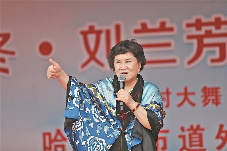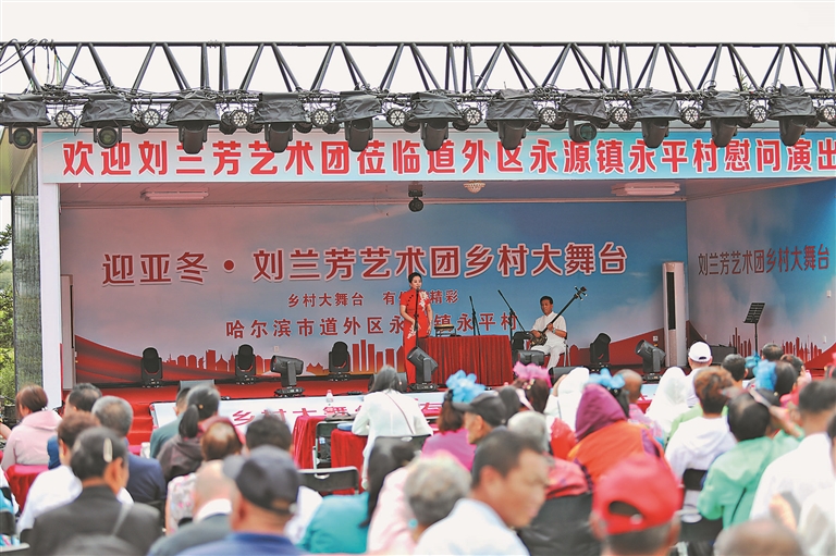 评书一段、大鼓一响、秧歌一曲……刘兰芳艺术团的老师们带来评书《康熙买马》、东北大鼓《杨靖宇大摆口袋阵》《绕口令》、二人转等经典作品演绎,并结合喜迎亚冬会、冰城好人好事,创作了主题快板书等文艺作品。整场演出阵容可谓强大,仅18位东北大鼓表演者中,就有来自黑龙江、吉林、辽宁三地的3位国家级传承人、3位省级传承人。现场气氛热烈、座无虚席,由于座位已满,有的村民还自带小马扎,融入观演大队伍。