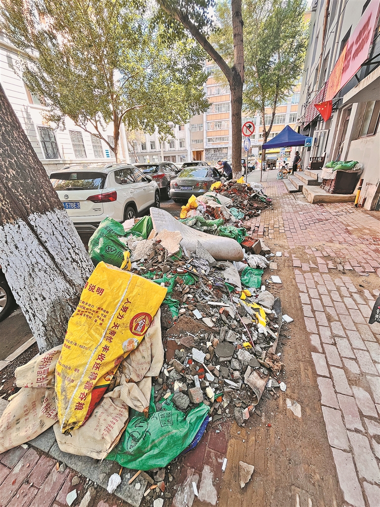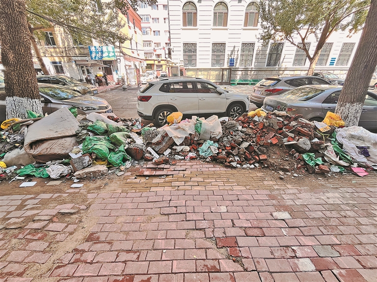 当天10时,记者来到电车街4号门前看到,路边两棵绿化树中间堆积了大量建筑垃圾,已经蔓延到了人行道上,出行的居民都需绕行。此处为居民区,来往行人较多,李女士告诉记者:“我家就在这附近,夏天这么多垃圾堆积不仅影响出行还影响环境,希望相关部门能处理一下。”