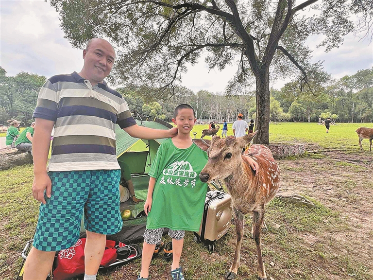 谁说登山就要“呼哧带喘”?生活报举办的森林徒步节,想咋爬、想咋玩,读者说了算。这不,刚进入景区没多久,不少小伙伴就选择在鹿苑中心安营扎寨。只见他们支起帐篷、打开天幕、铺上野餐垫,再拿出背包里的鸭货、熟食、水果……爬山的事一会儿再说吧,一家人先高高兴兴地开餐,大人们推杯换盏,孩子们忙着给小鹿“喂饭”,玉米粒、胡萝卜、白菜叶,小鹿们吃得不亦乐乎,孩子们笑得前仰后合。
