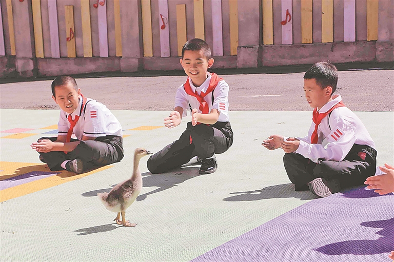 据介绍,哈市新康小学今年假期用教育主管部门发放的孵化器,孵化出了一只小鹅。开学第一天,小鹅“康康”成了校园明星,被孩子们用爱包围着。奥运会冠军的事迹展板也成为迎新亮点。