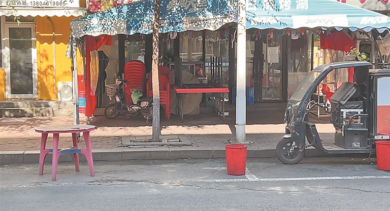 在红领巾街59号的粮油店门前,商户使用三轮车、桌椅、反光锥等将门前道路全部占据。附近沿街居民还有使用大铁锅、柴火垛、水泥墩等杂物的,几乎把路边全部占满。在红领巾街上的药店及棋牌室门前,商户使用地锁、水泥墩、挡车桩,将门前几个公共车位占得严严实实。
