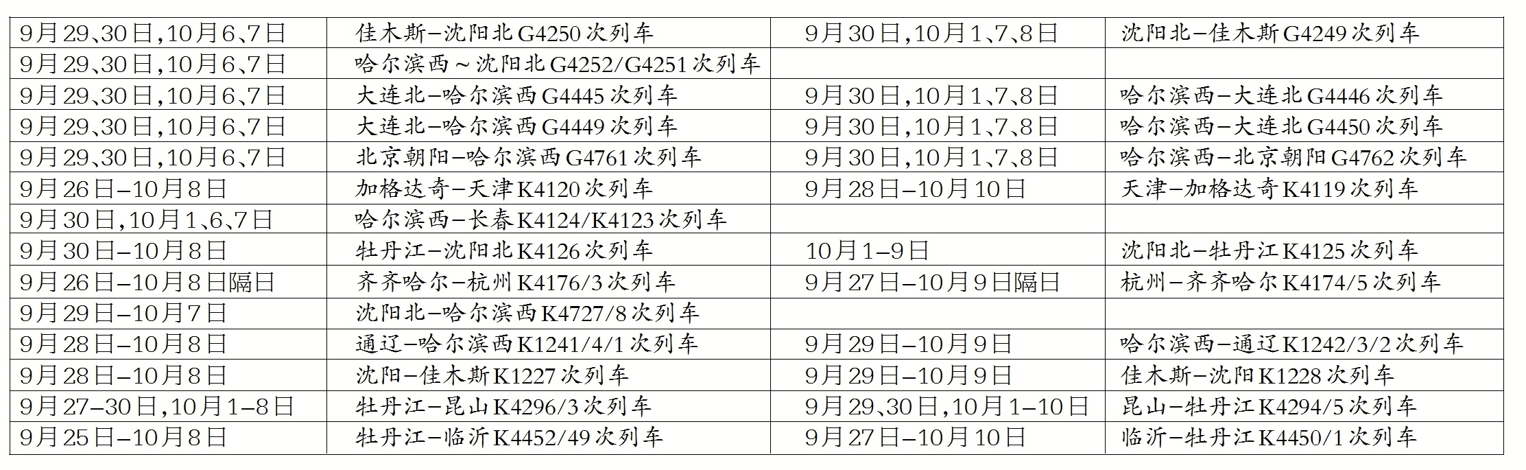 生活报讯 (记者栾德谦) 26日,生活报记者从铁路部门获悉,根据“十一”假期客流出行需求,哈铁部门临时增开以下旅客列车。